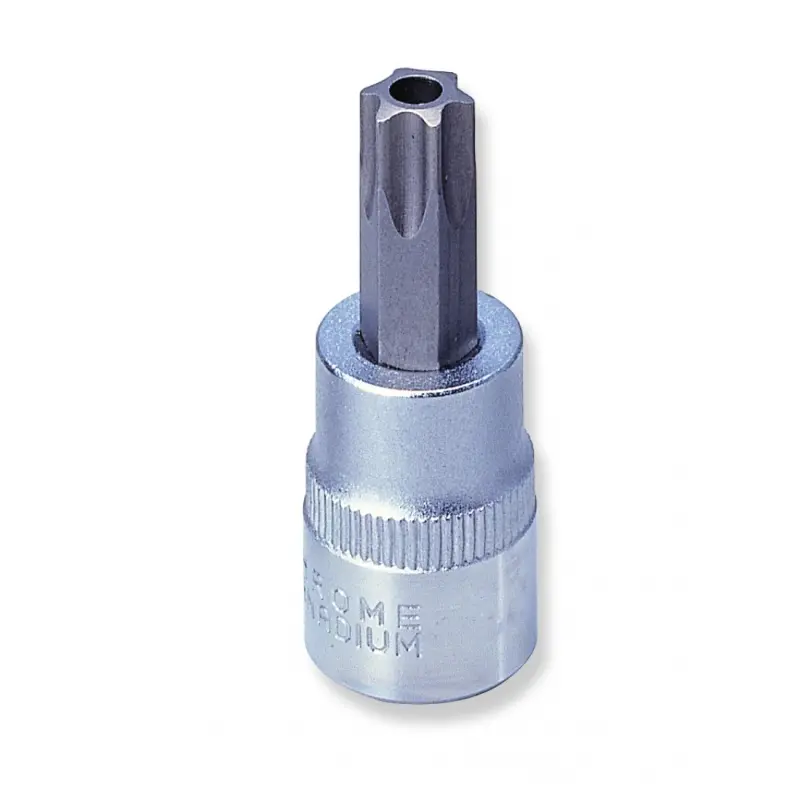 Zástrčná šestihranná hlavice Torx s otvorem Jonnesway Pro úchyt 3/8“, chrom-vanadiová ocel, splňuje normy DIN 3120.