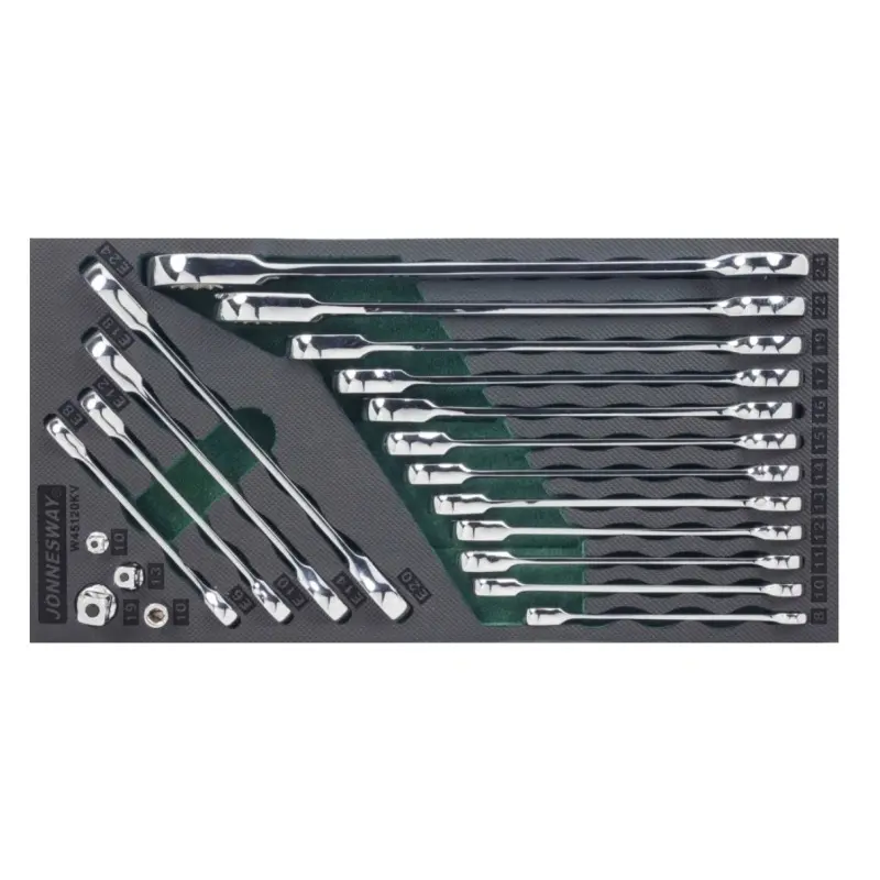 - 12× očkoplochý klíč s ráčnou (72 zubů), rozměry: 8 – 10 – 11 – 12 – 13 – 14 – 15 – 16 – 17 – 19 – 22 – 24 mm (řada W45).