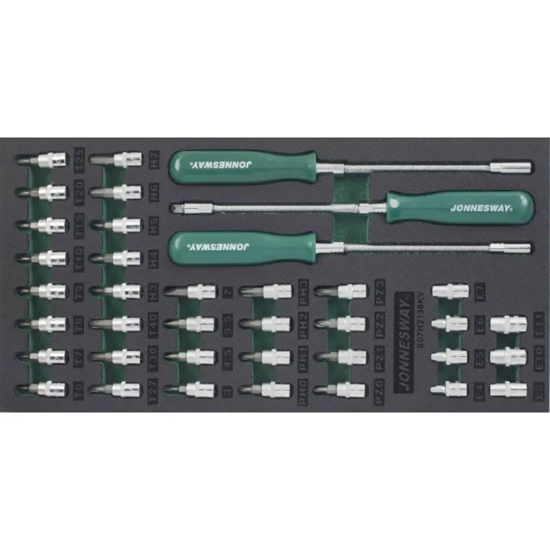 Pěnový modul EVA, vel. „B“ (190 x 380 mm): Velká 38dílná sada zástrčných šroubovákových hlavic různých profilů (Philips a Pozidriv) a ohebných rukojetí (šroubováků)