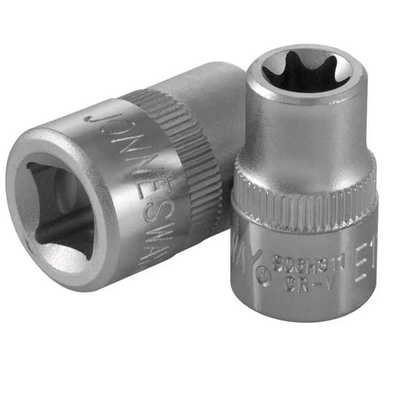 Nástrčné hlavice Torx E značky Jonnesway pro úchyt 1/2". Polomatný finiš. Chrom-vanadiová ocel, splňují normu DIN 3120.