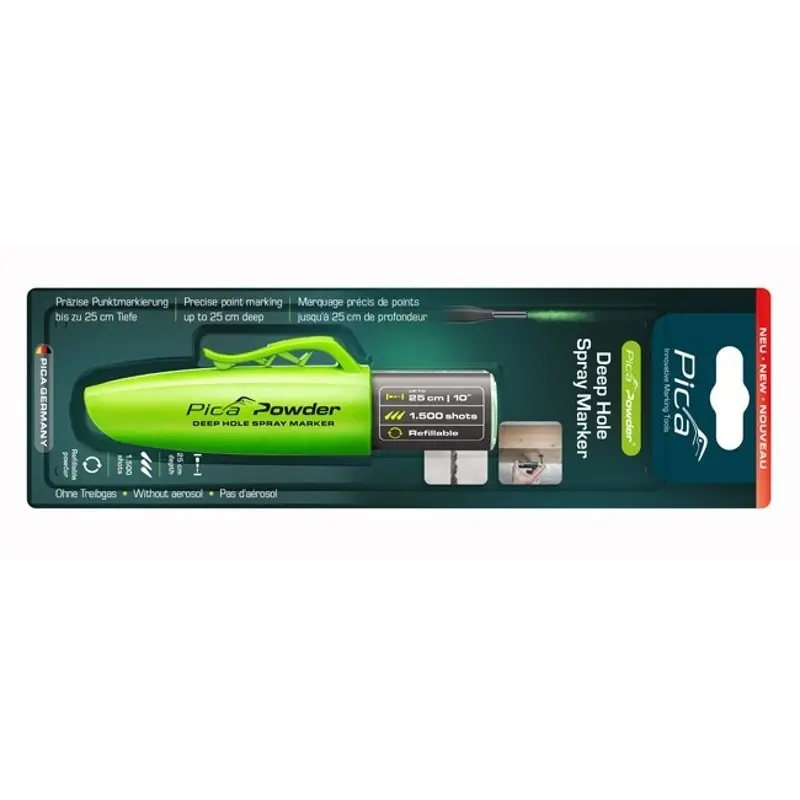 Pica Powder Deep Hole Spray Marker na blistru umožňuje rychlé a přesné značení na suchých i mokrých površích. Práškový sprej je vhodný pro stavební i řemeslné práce.