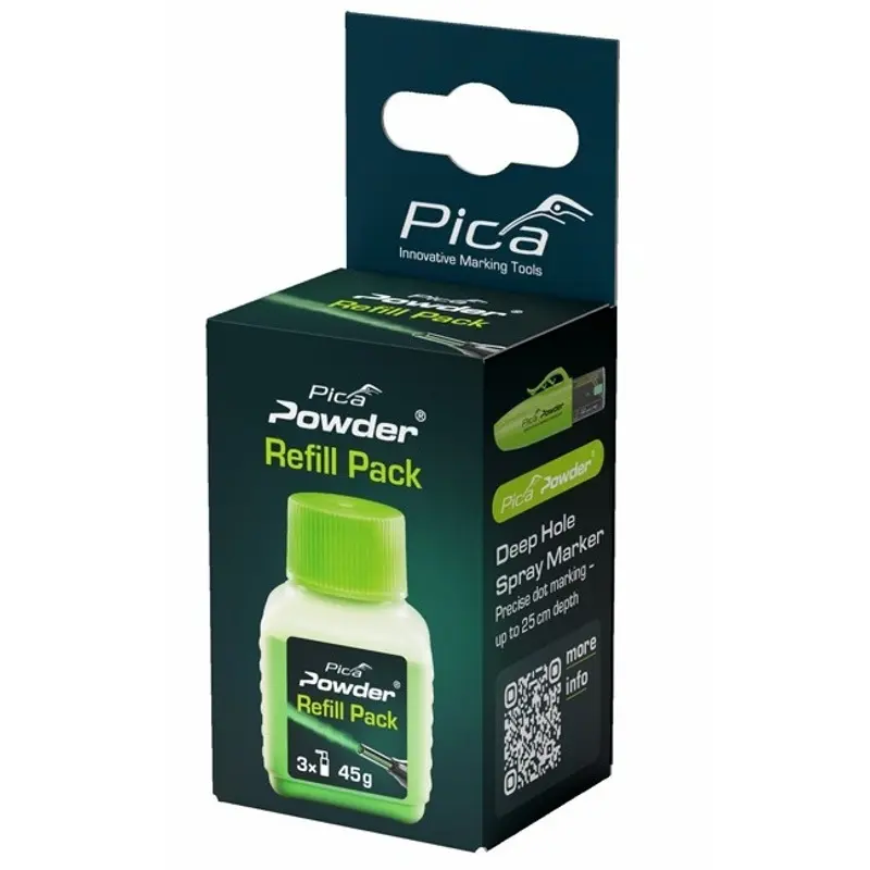 Náhradní náplň pro Pica Powder Spraymarker na blistru. Zelený fluorescenční křídový prášek.