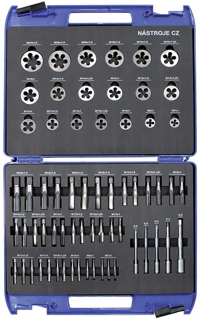 - Závitová kruhová čelist, metrický závit jemný, EN 22568 - M 8x1; 10x1; 10x1,25; 11x1; 12x1; 12x1,25; 12x1,5; 14x1; 14x1,25; 14x1,5; 16x1; 16x1 LH; 16x1,5; 18x1,5; 20x1,5; 22x1,5; 24x1,5