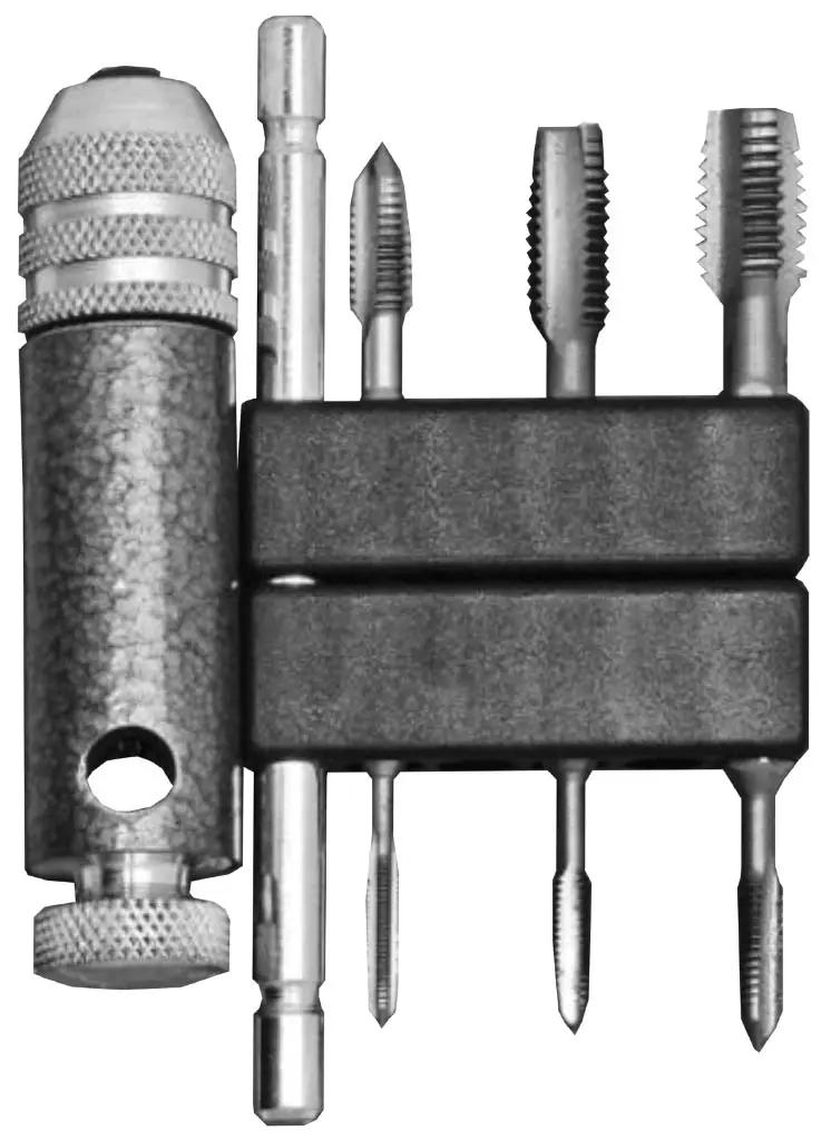 Sada závitových bitů se šestihrannou stopkou 6,35 mm (1/4") určená k řezání metrických závitů ISO podle DIN 13, dodávaná v plastovém držáku.